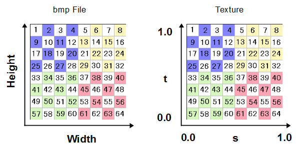 bmp フォーマットでは画像の高さデータ (BmpHeight) が負の場合は上の図と異なって左上が原点となり、上から順番にピクセルデータが格納されているため、高さデータ (BmpHeight) が負の場合は bmp 画像のピクセルデータは上から取得しています。 また、各ピクセルはbmpファイルでは青、緑、赤の順に格納されていますが、テクスチャ用に赤、緑、青の順に変換しています。