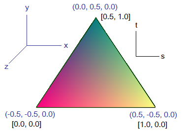 これまでと同じく 今回のサンプル でも三角形1枚を使いますが、前々回の頂点情報 ではテクスチャ座標の呼び方がDirectX 形式(uv座標)になっていたため、OpenGLで使われるs座標、t座標に修正しました。